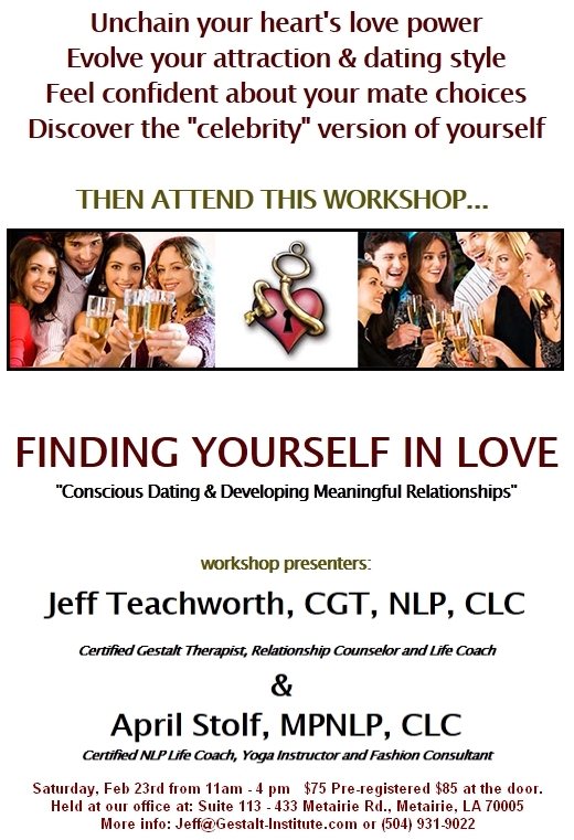 Our workshops combine Gestalt with The Psychogenetic System™ Model of Pre-Marital, Couple, Family & Parenting Coaching, Forgiveness, Self-acceptance, Self-esteem, Intimacy, NLP, Codependency, Addiction, Body Work, Dreamwork, Psychodrama, Grief, Meditation, and the popular Money Game workshop. All events are open to everyone for personal work and to counselors for personal work and/or professional training.